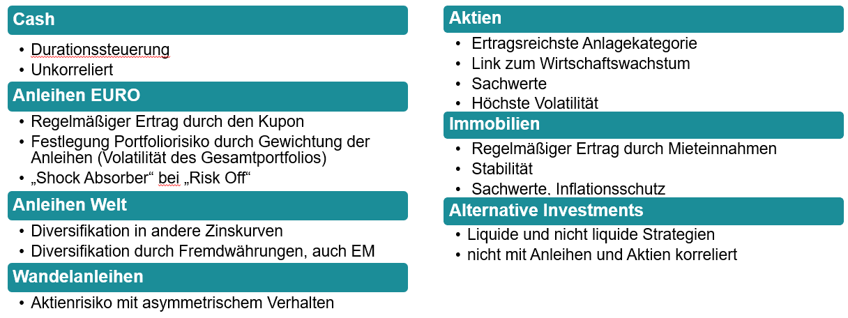 Mit einem breiten Spektrum an Assetklassen gewährleisten wir einen hohen Diversifikationsgrad. Durch die gezielte Kombination unterschiedlich agierender Assetklassen minimieren wir Risiken und maximieren Chancen.